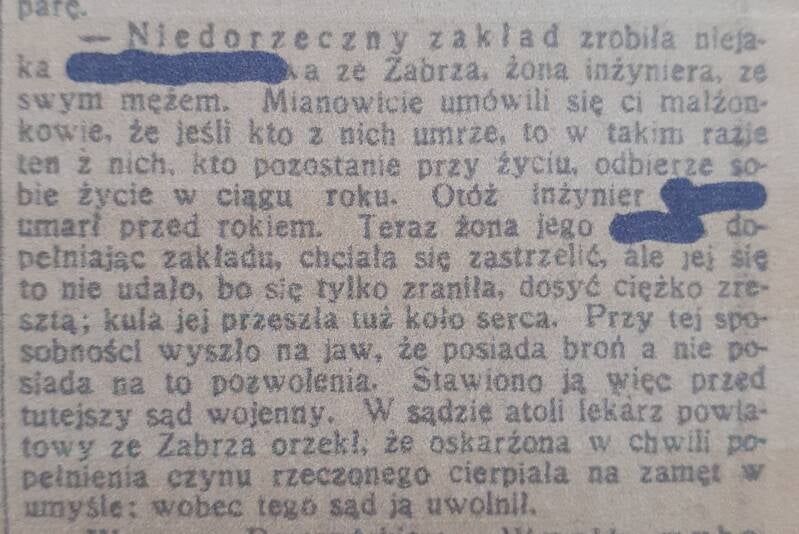 In einem polnisch-sprachigen Zeitungsartikel vom 25.11.1919 fand ich schließlich einen Hinweis auf die Gerüchte in meiner Familie. Dort wurde eine nebulöse Wette der zweiten Ehefrau beschrieben, die sie ein Jahr nach seinem Tod einlöste. Offenbar hatte das Paar beschlossen, falls sie je durch den Tod getrennt werden würden, dem eigenen Leben spätestens nach einem Jahr ein Ende zu setzen. Dabei schoss sich die junge Witwe knapp an ihrem Herzen vorbei. Sie überlebte schwer verletzt und wurde wegen unerlaubten Waffenbesitzes angeklagt.